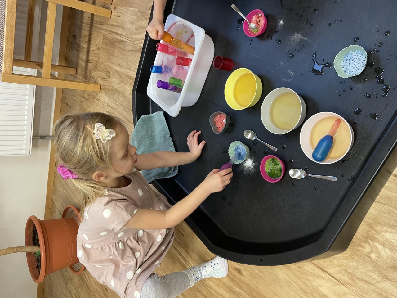 např. modelínou, kinetickým pískem, slizem, vodními perlami a gelovými kuličkami, barevnou rýží, atd. Vyzkoušely si i experiment s jedlou sodou.