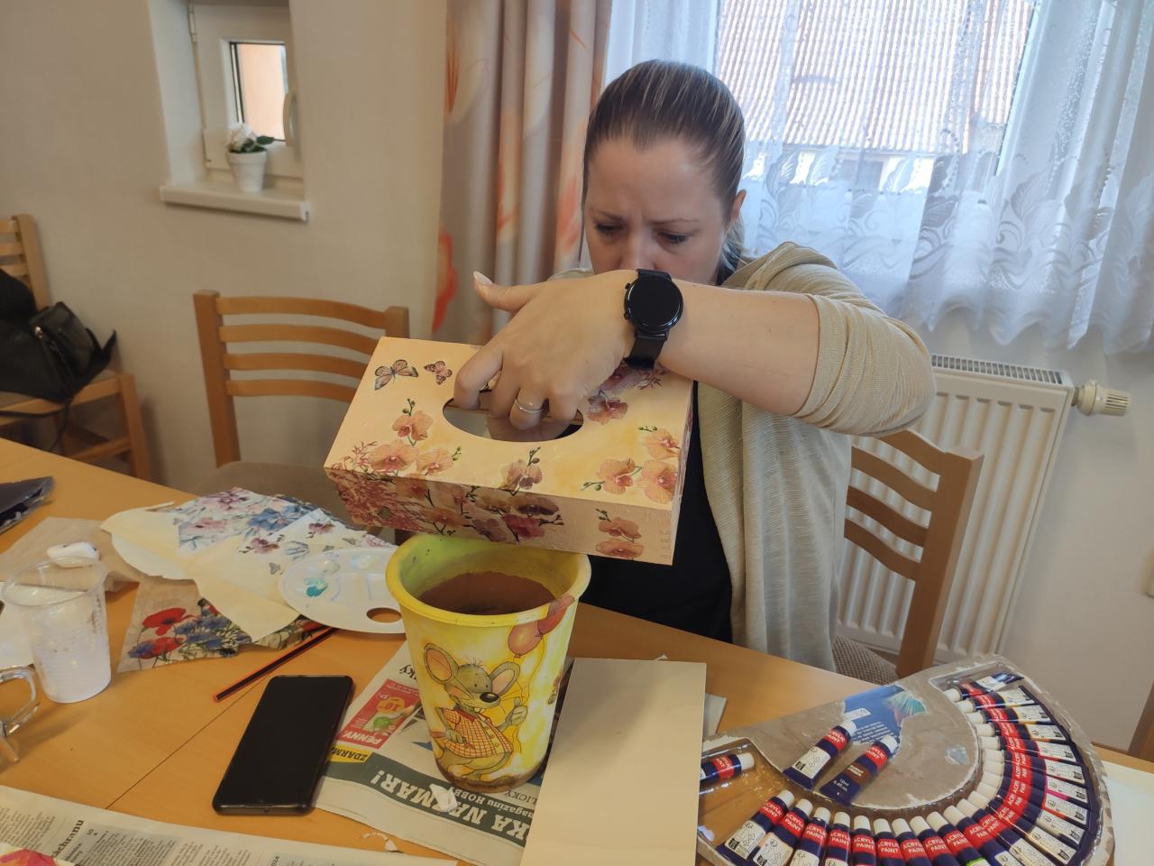 Obec zajistila materiál pro výrobu ozdobných krabiček na papírové kapesníčky – dřevěný kryt a dekorativní ubrousky. Účastnice kurzu si donesly vlastní ozdobné ubrousky. Zúčastnilo se 8 tvořivých žen a za zaplacené kurzovné si své výtvory opět mohly vzít domů.