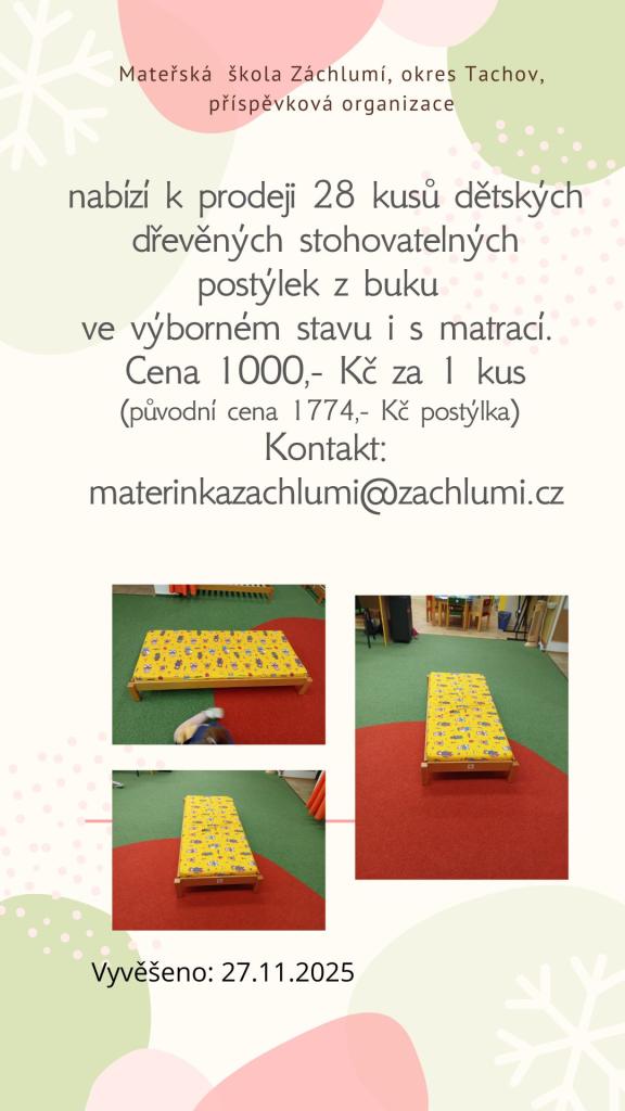 Mateřská škola Záchlumí nabízí veřejnosti možnost zakoupit 28 kusů dětských dřevěných stohovatelných postýlek z bukového dřeva. Každá postýlka je v perfektním stavu, pečlivě udržovaná a dodává se včetně matrace. Jedná se o kvalitní a pevné provedení, které je ideální do mateřských škol, školních družin, dětských koutků nebo i domácností, kde poslouží například při přespávání dětí.