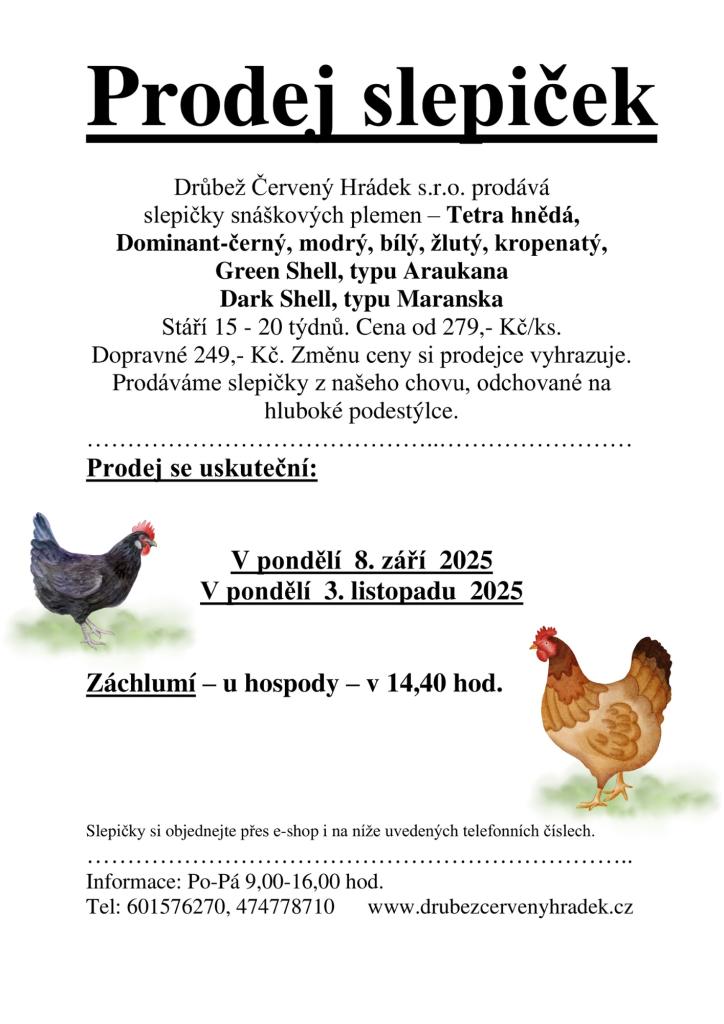 Oznamujeme, že se v naší obci uskuteční prodej slepiček snáškových plemen od Drůbeže Červený Hrádek s.r.o. Nabízeny budou slepičky ve stáří 15–20 týdnů různých plemen (Tetra hnědá, Dominant – černý, modrý, bílý, žlutý, kropenatý, Green Shell typu Araukana a Dark Shell typu Maranska).